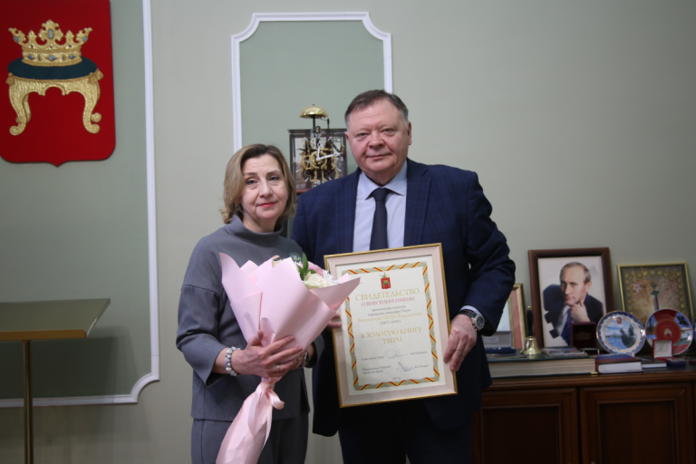 Директор Тверского центра документации новейшей истории Наталья Руф стала почетным гостем городской Думы. Председатель ТГД Евгений Пичуев вручил правнучке выдающегося инженера и архитектора Петра Богомолова свидетельство о занесении его имени в Золотую книгу Твери.