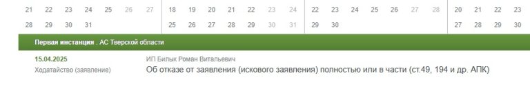 Судебное заседание было отложено на 16 апреля. Однако накануне во вторник Роман Билык подал ходатайство об отказе от своего искового заявления, о чём свидетельствуют данные из картотеки суда.